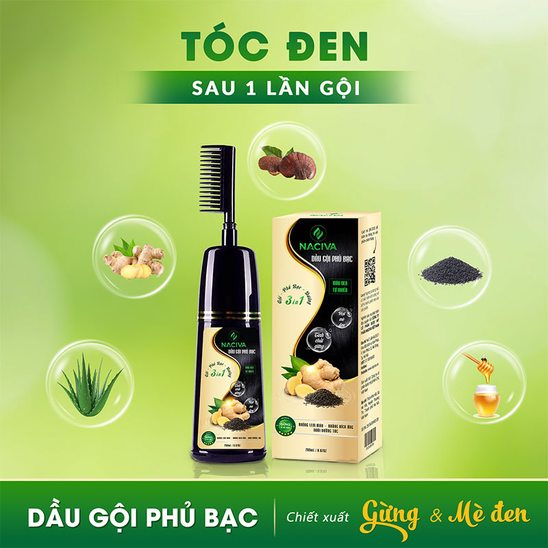 DẦU GỘI PHỦ BẠC NACIVA chiết xuất từ thảo dược tự nhiên, tinh chất gừng và hạt mè đen hỗ trợ làm tóc đen tự nhiên chỉ trong 10 phút, giúp tóc đen đẹp, chắc khỏe và phục hồi tóc hư tổn, kích thích mọc tóc (Dầu gội phủ bạc Naciva không phải thuốc nhuộm tóc, không hóa chất, không làm đen da đầu,da tay)…